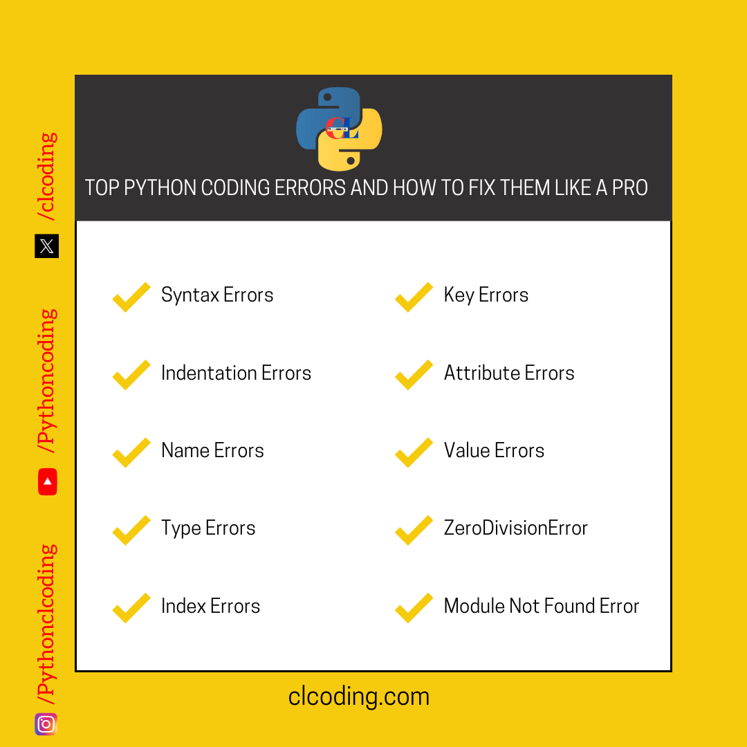 By understanding and fixing these common Python errors, you can write more reliable and error-free code. Always read error messages carefully and debug systematically for efficient problem-solving!