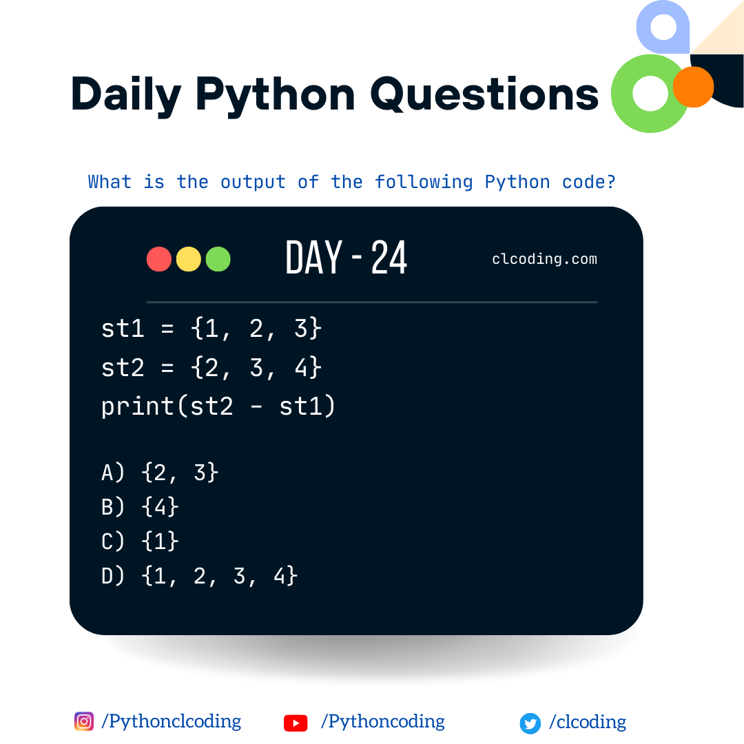 The result of st2 - st1 will be a new set containing the elements that are in st2 but not in st1. In this case, it will be {4}, because 4 is in st2 but not in st1.